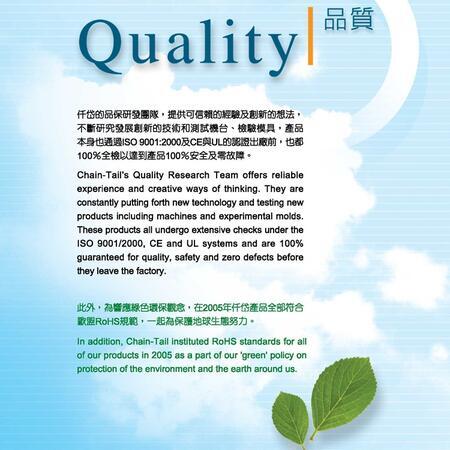 此外,為響應綠色環(huán)保觀念,在2005年仟岱產(chǎn)品全部符合歐盟ROHS規(guī)范,一起為保護地球生態(tài)努力。